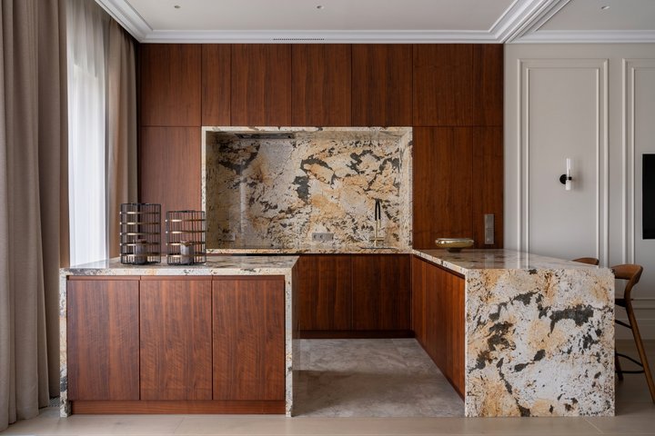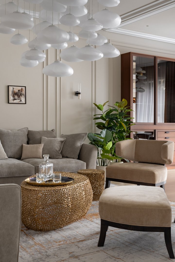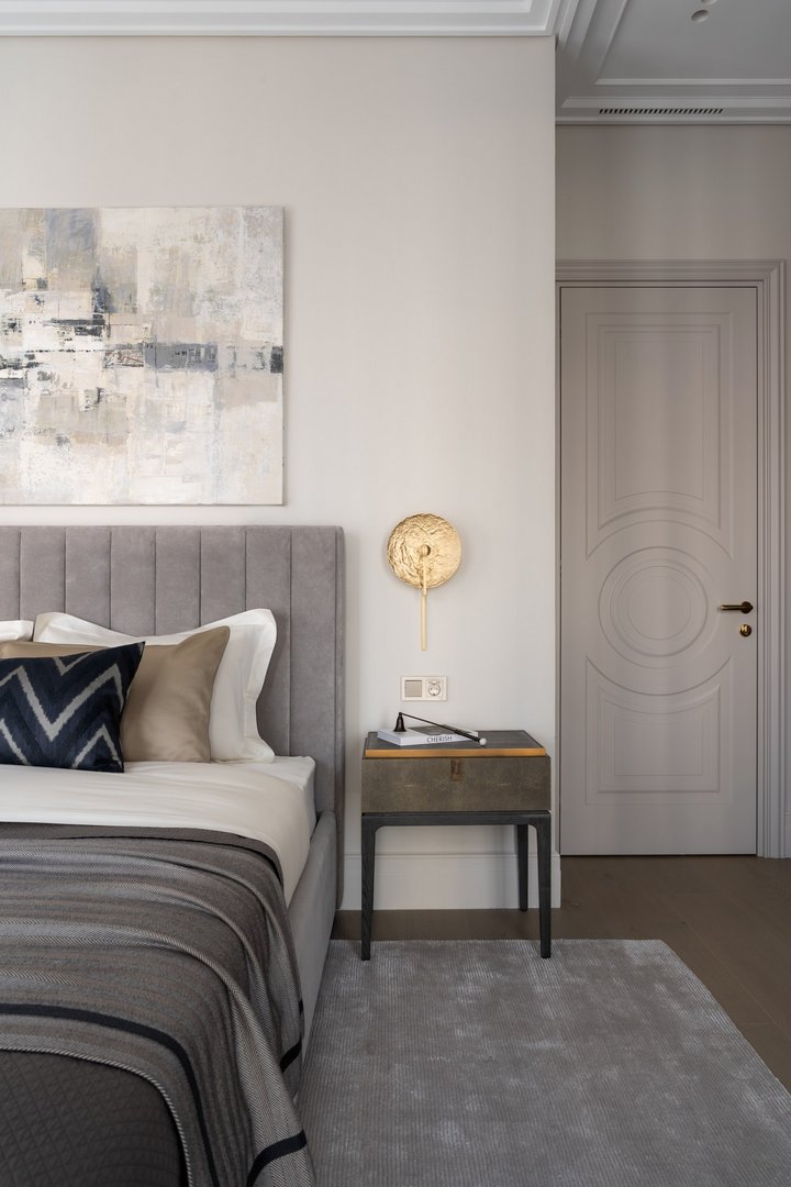 Внутреннее пространство подчинено четким композиционным и логическим осям помещения. Например, заходя в квартиру, из прихожей мы видим большой портал в гостиную, а далее — окно с красивой панорамой на город. Перспектива коридора завершается простенком, предусмотренным для размещения арт-объектов. Отделка стен гипсовыми молдингами довольно обильна, но при этом сдержанна по формам и сечениям, благодаря чему интерьер производит впечатление сдержанной элегантности, не лишенной шика.