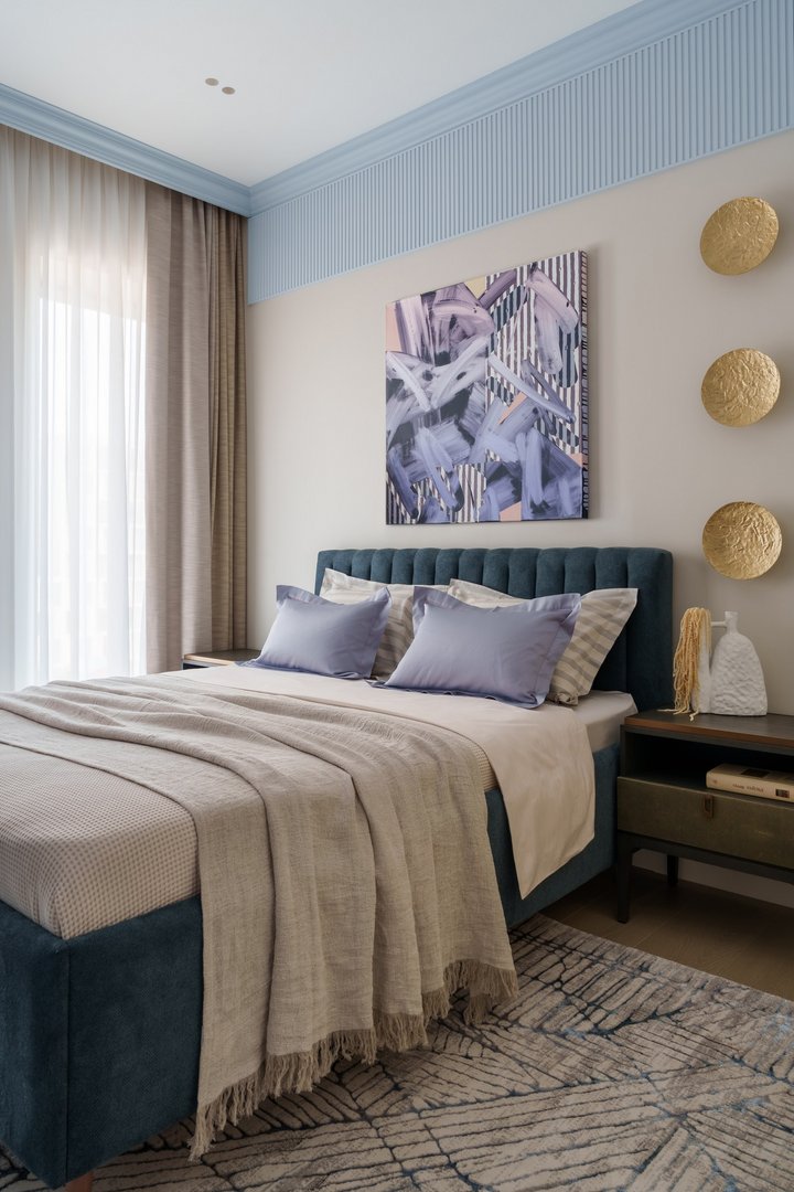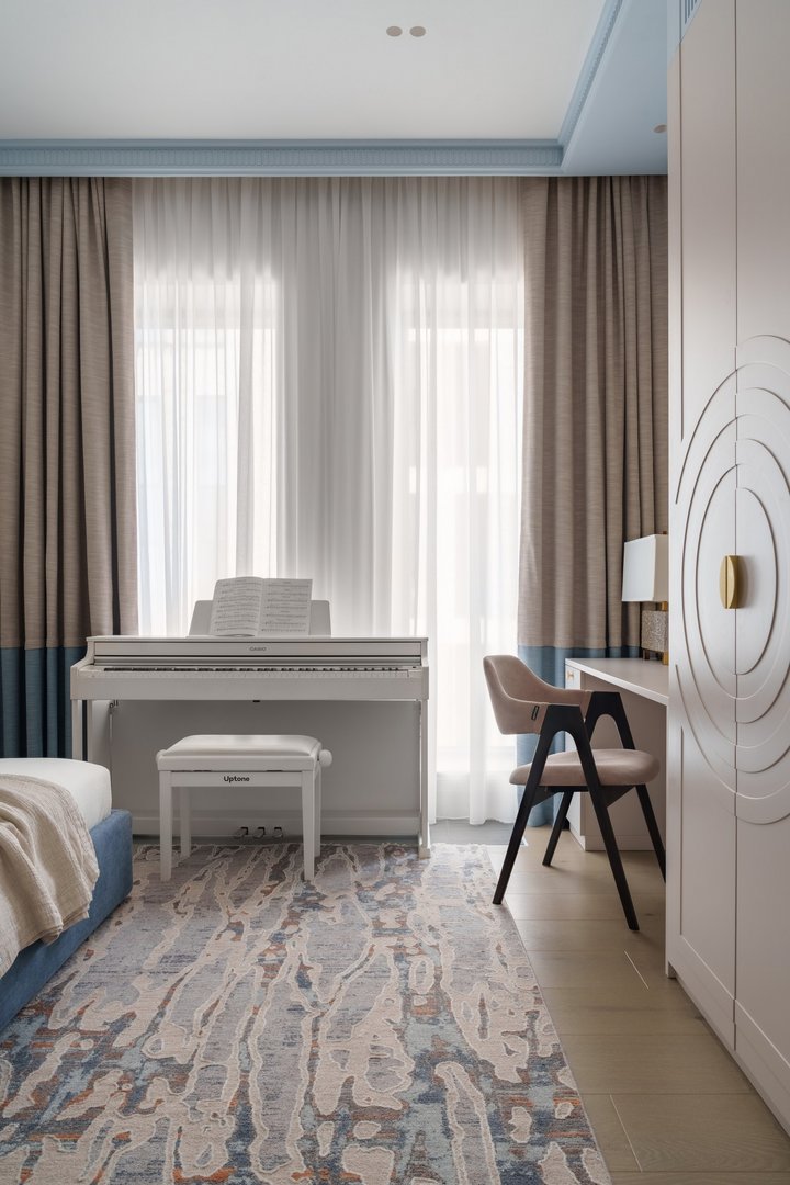 Внутреннее пространство, выполненное в серебристо-голубой палитре, создает ощущение воздушности и простора.