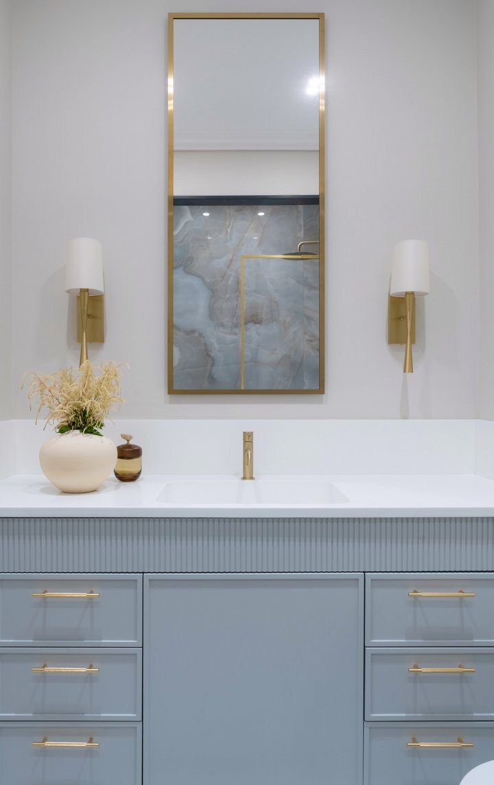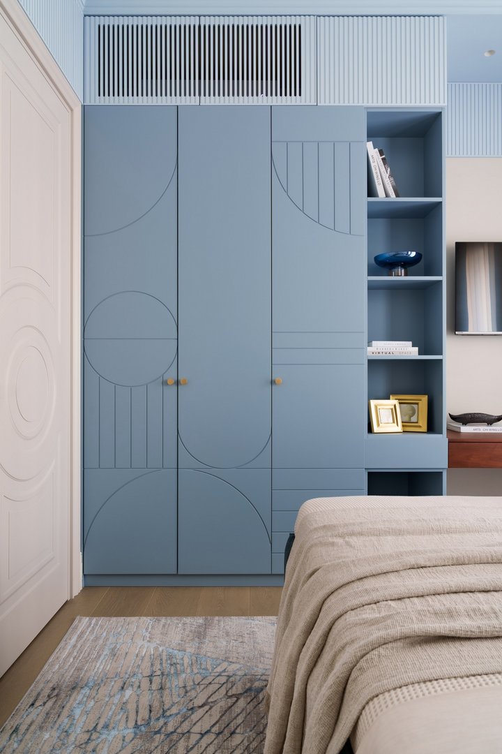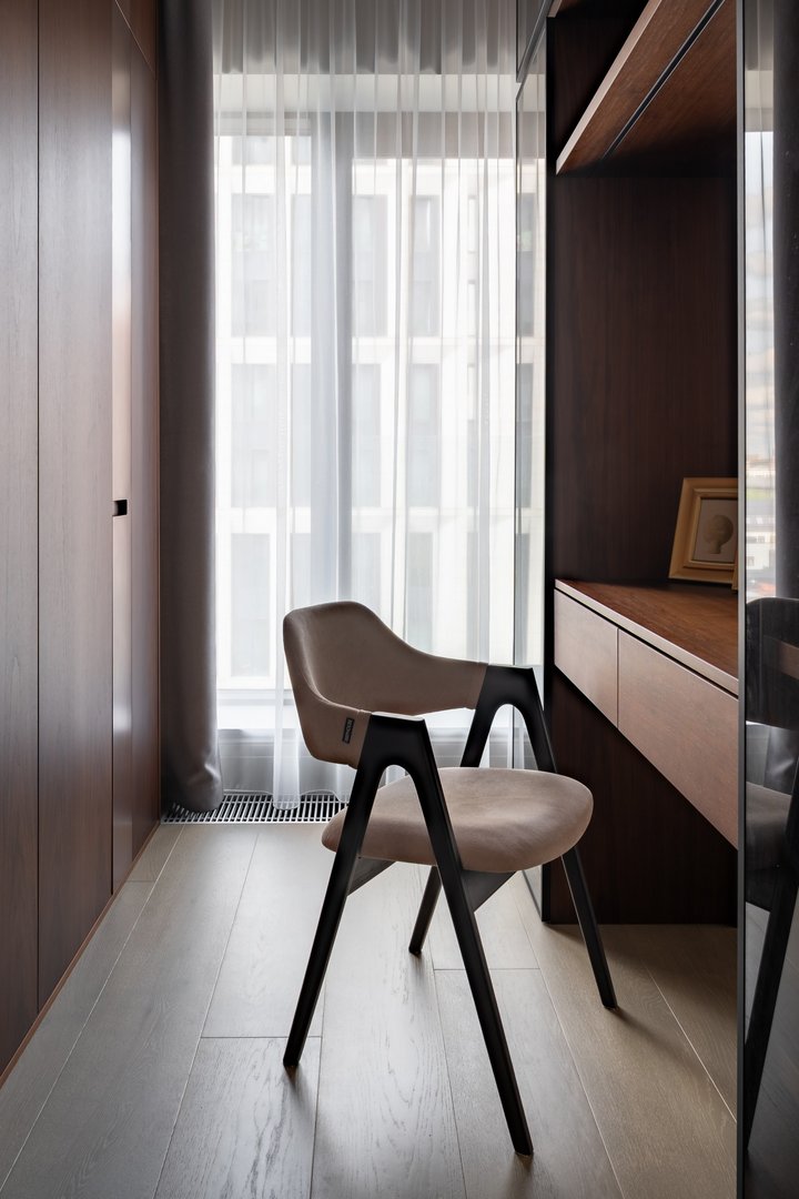 Еще одно нестандартное решение — шкаф со стеклянными фасадами с двух сторон, размещенный в мастер-зоне. Он разделяет пространство на гардеробную и спальню, но при этом не уменьшает пространство. Внутри стеклянного шкафа располагается рабочее место — косметический столик хозяйки спальни.