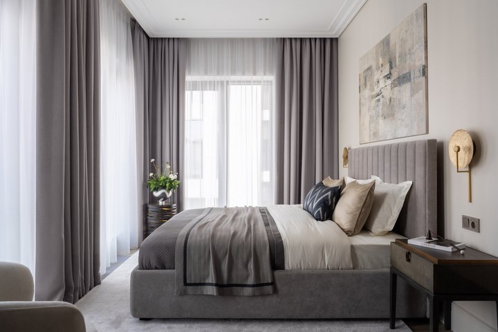 Элементы интерьера: паркет Finex; корпусная мебель и кухня ST.Inter; диваны и кресла Ultraform; обеденный стол, кровати, банкетки, маленькое кресло Dantone Home; сантехника Villeroy&Boche, Omnires; ковры Arte de Vivre.